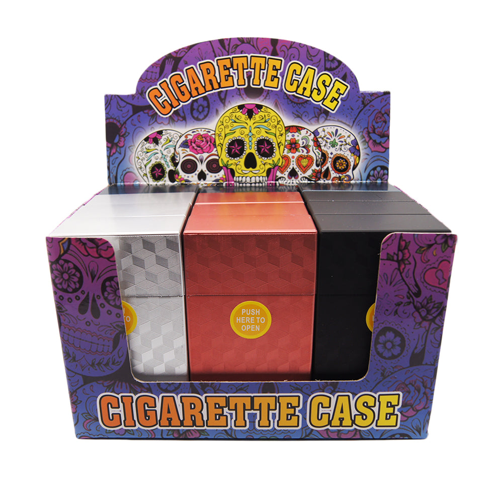 Assorted 3-D square holographic metallic-finish, plastic cigarette cases with push-to-open lid. Fits cigarette size 100s.