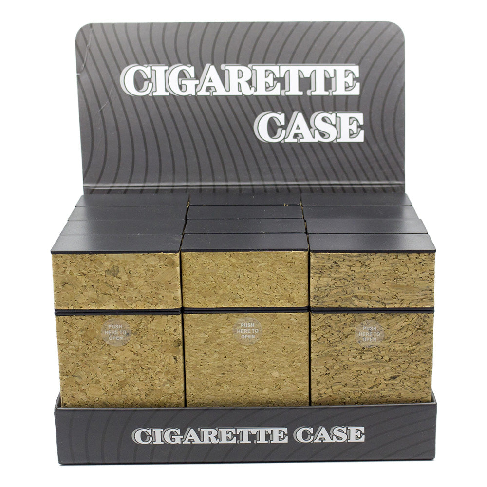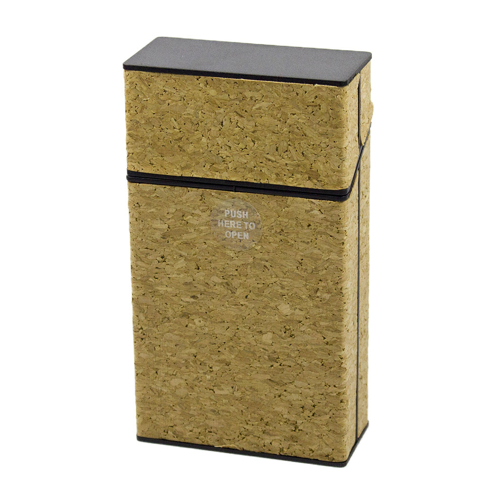 Wood grain graphics, plastic cigarette cases with push-to-open lid. 20 cigarette capacity. Fits cigarette size 100s.
