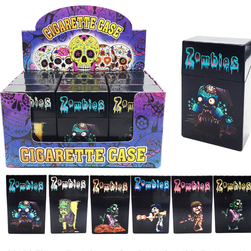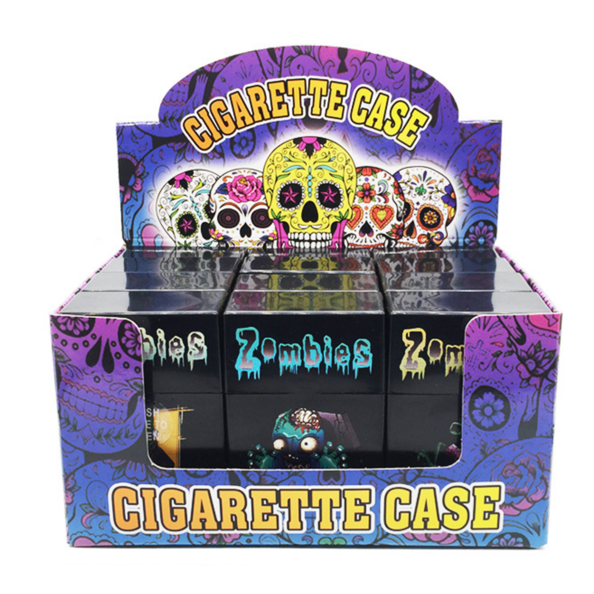 Assorted zombie graphics, plastic cigarette cases with push-to-open lid. Fits cigarette size 100s.