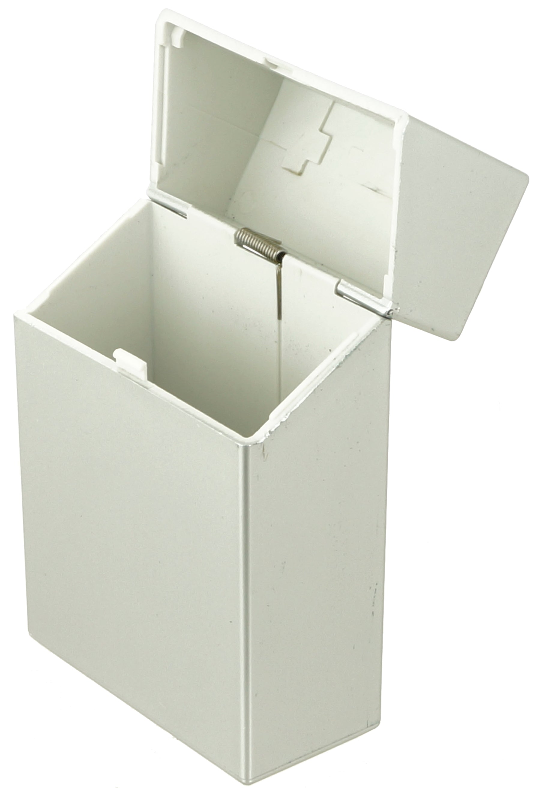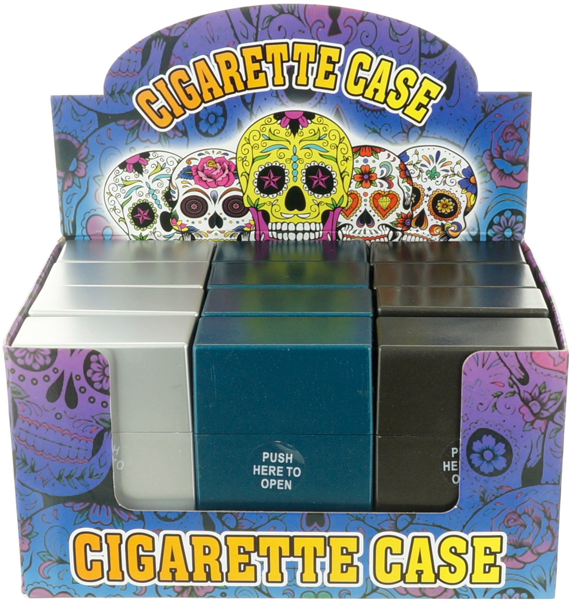 Metallic finish, plastic cigarette cases with push-to-open lid. Fits King sized cigarettes.