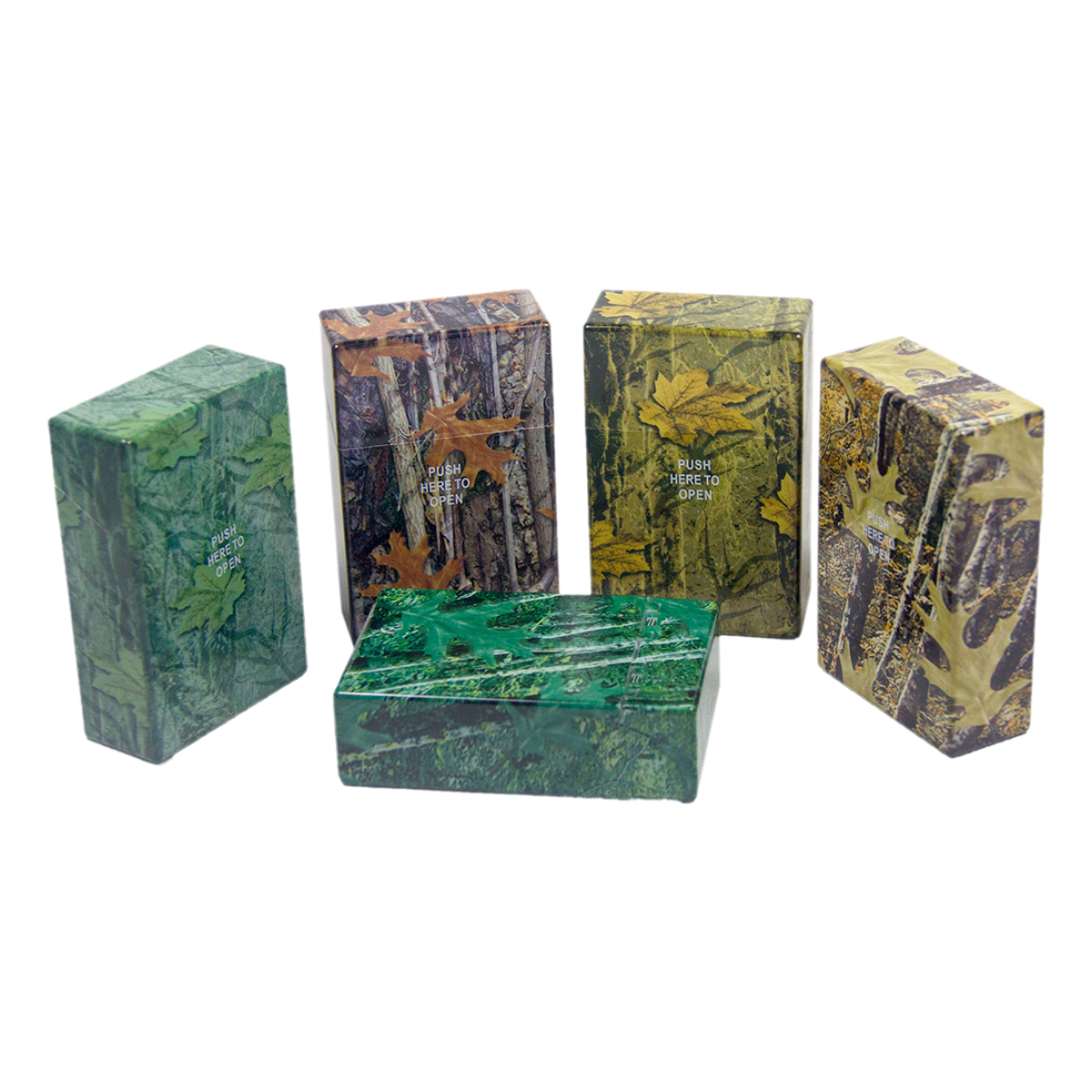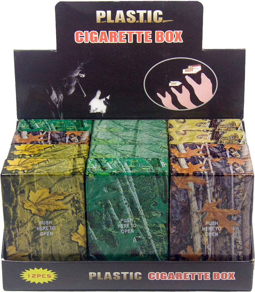 Assorted camouflage graphics, plastic cigarette cases with push-to-open lid. Fits King sized cigarettes.