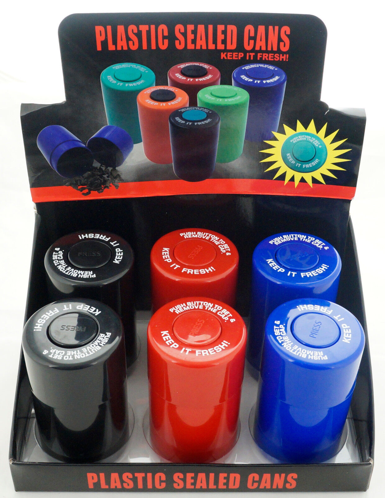 Airtight plastic storage containers - "Keep it fresh!". Assorted colors - black, blue, red. Use these jars to keep your herbs, coffee, or other ingredients fresh.