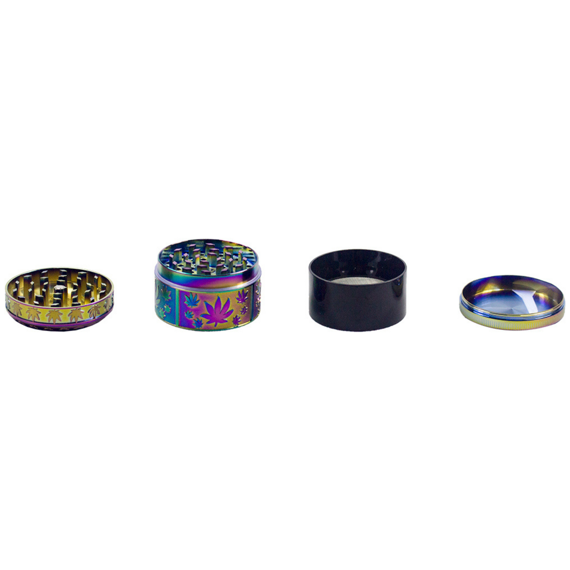 Zinc alloy grinder with embossed leaves. Each display includes an assortment of rainbow and black colors.