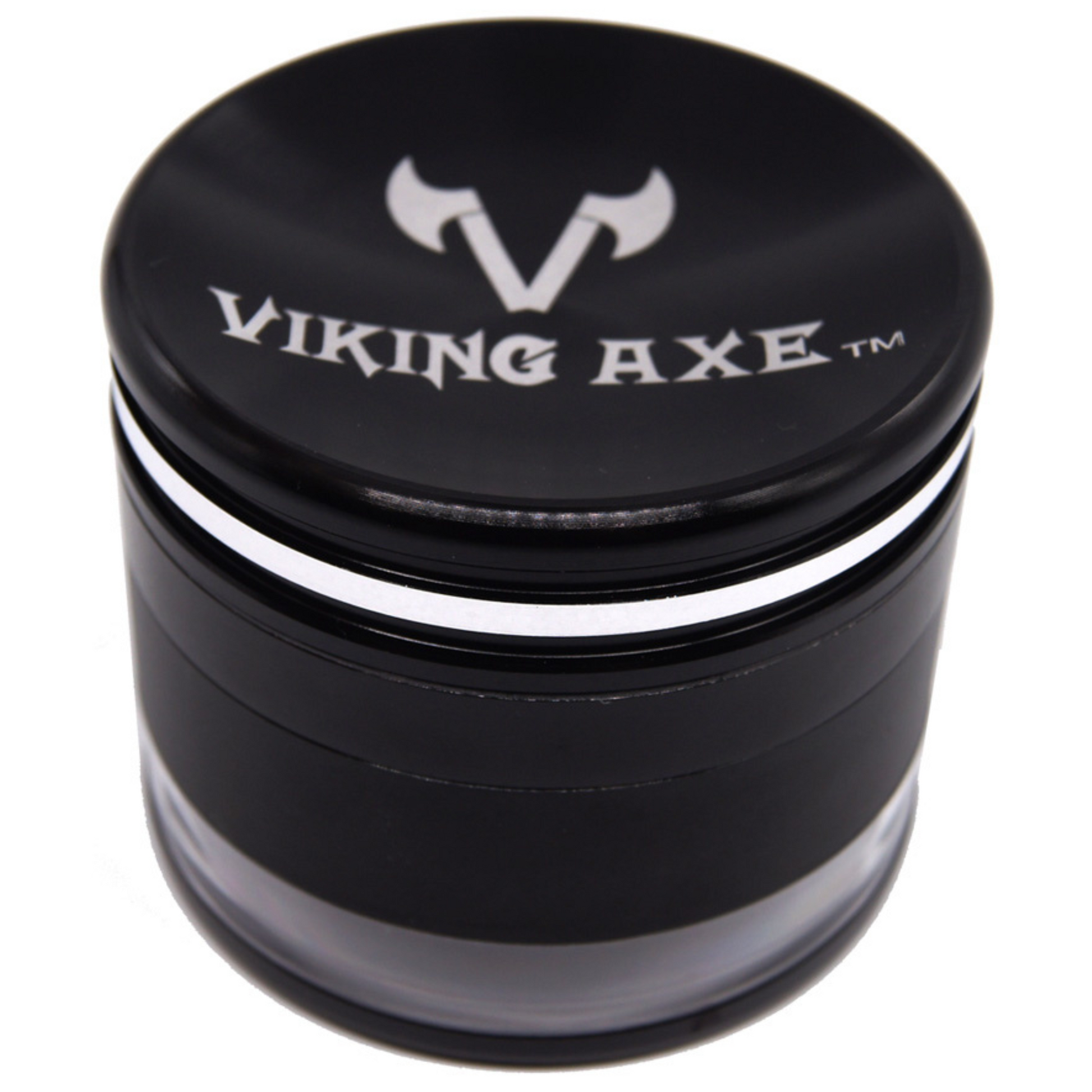 Viking Axe Premium Grinder with a transparent kief collection chamber. This 63mm aluminum grinder gives a nod to our OG sunken top design and comes with 4 parts and comes in black.