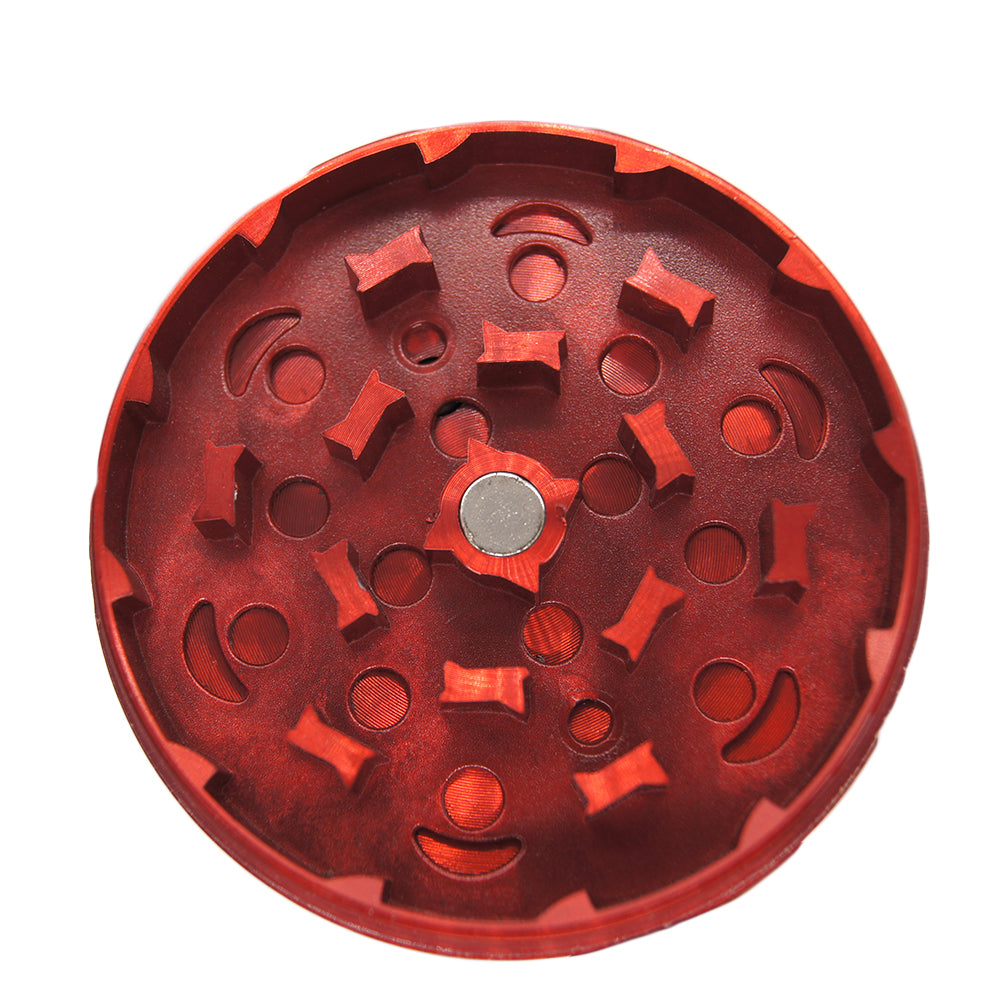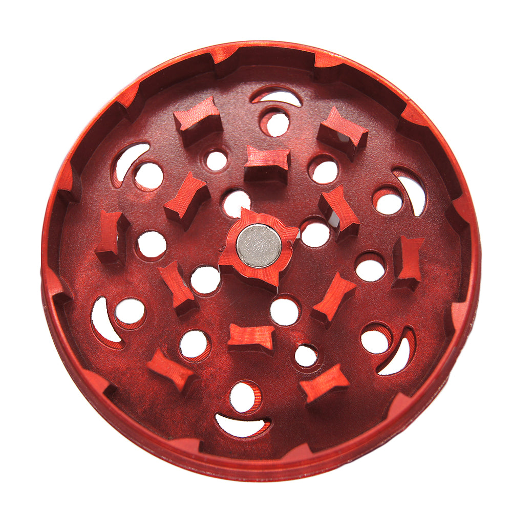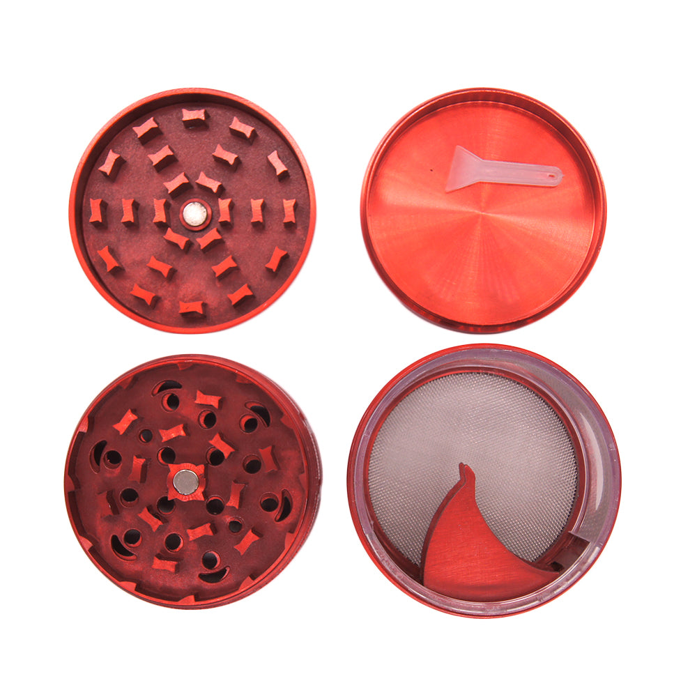 Viking Axe Premium Shutter Grinder with peek-thru window and pouring spout. The shutter mechanism is built into the bottom of the grinding chamber and can be opened to allow your herb to fall through or closed to keep the herb in the grinding chamber. This 63mm zinc alloy grinder comes with 4 parts and comes in green and red.