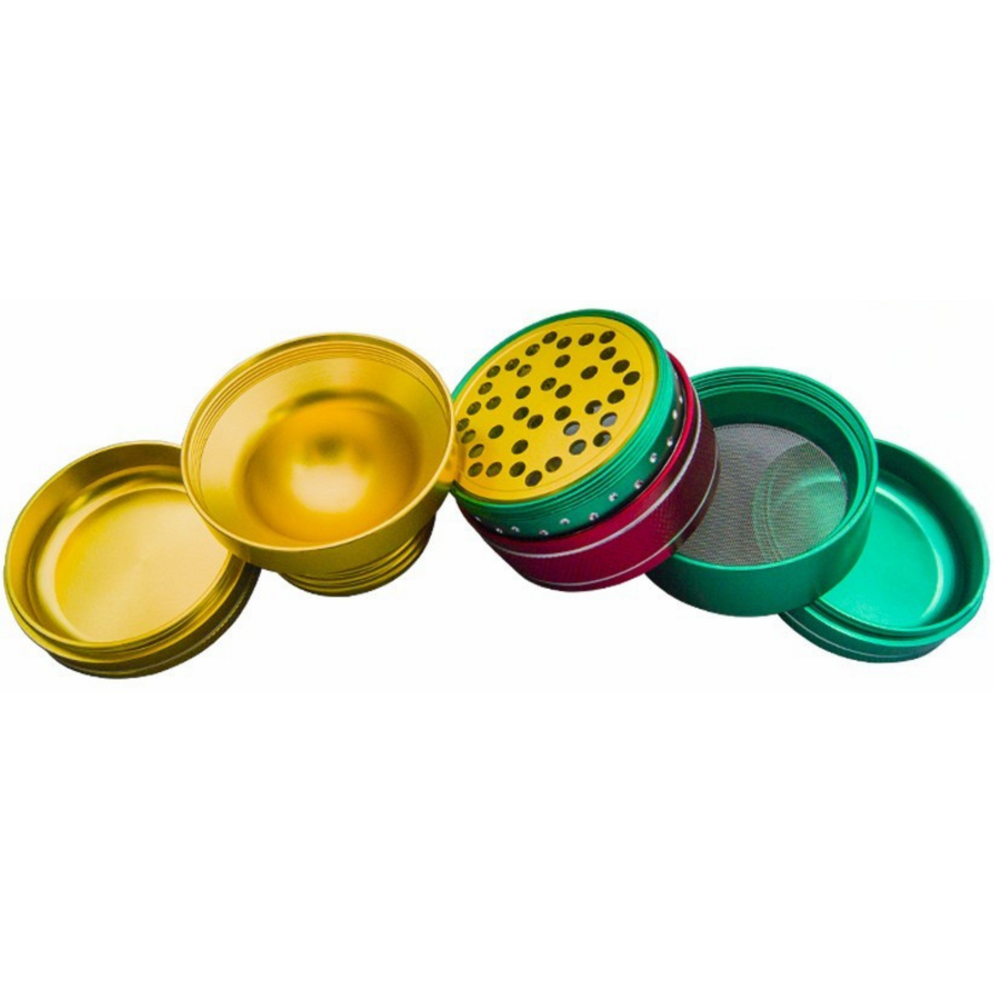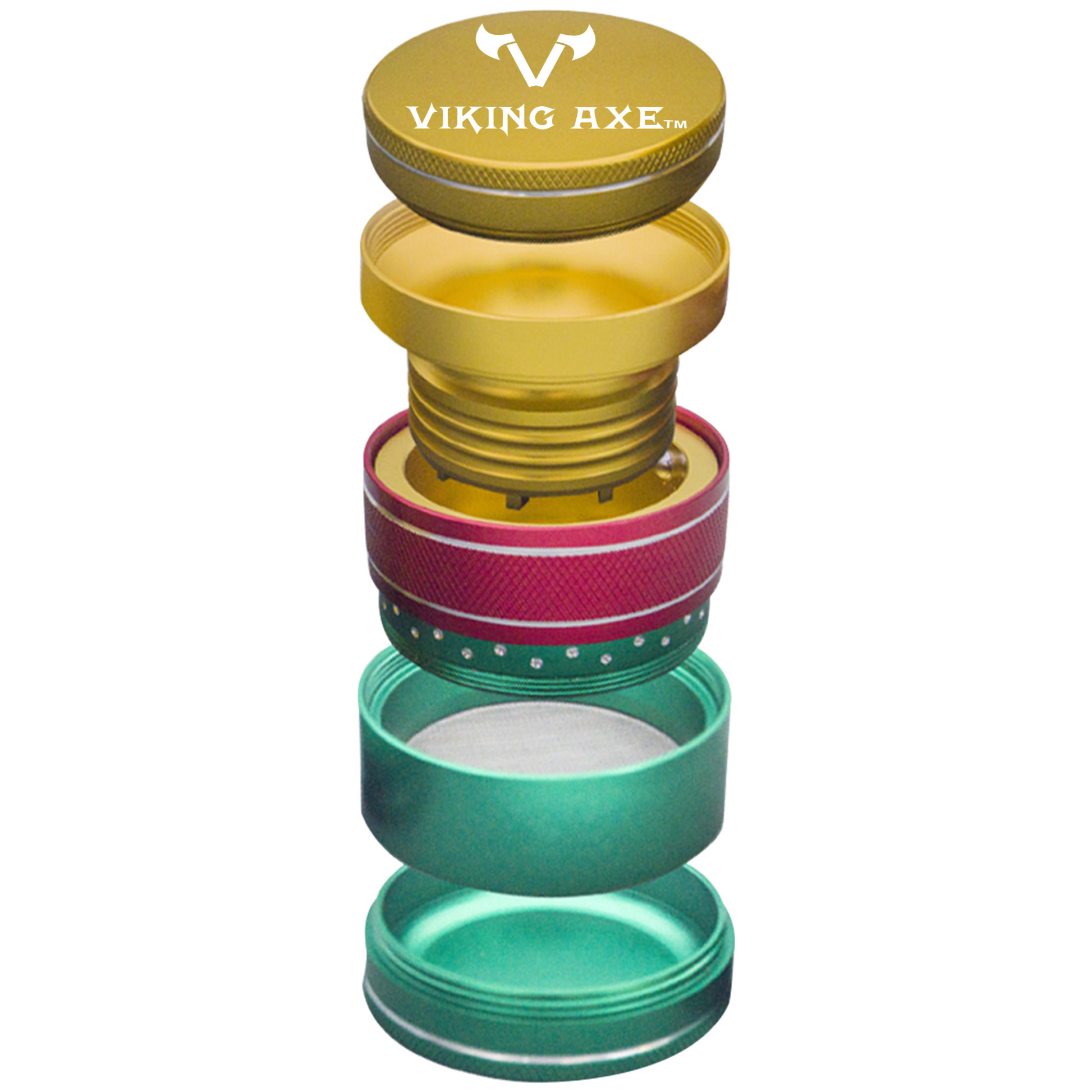 Viking Axe Premium Mid-Ring Lock-and-Release Grinder. Made of aircraft grade aluminum and neodymium magnets. With an extra storage compartment, this 63mm aluminum grinder includes 5 parts and 4 colors: black, blue, green, and rasta.