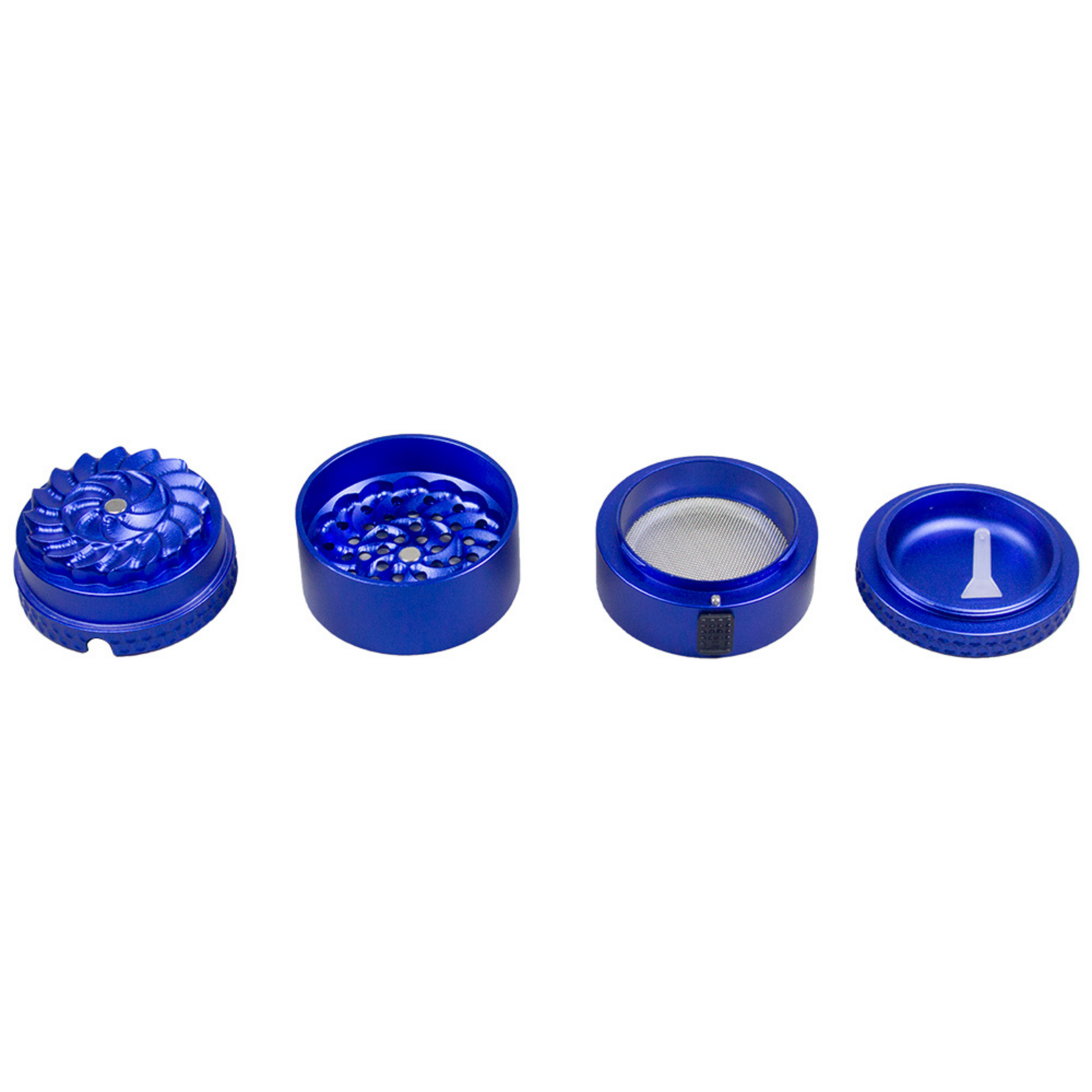 Viking Axe Toothless Press Grinder. Made of aircraft grade aluminum and neodymium magnets. This 63mm aluminum grinder has a collection chamber with a unique locking mechanism and includes 4 parts and 2 colors: blue, and gun metal.