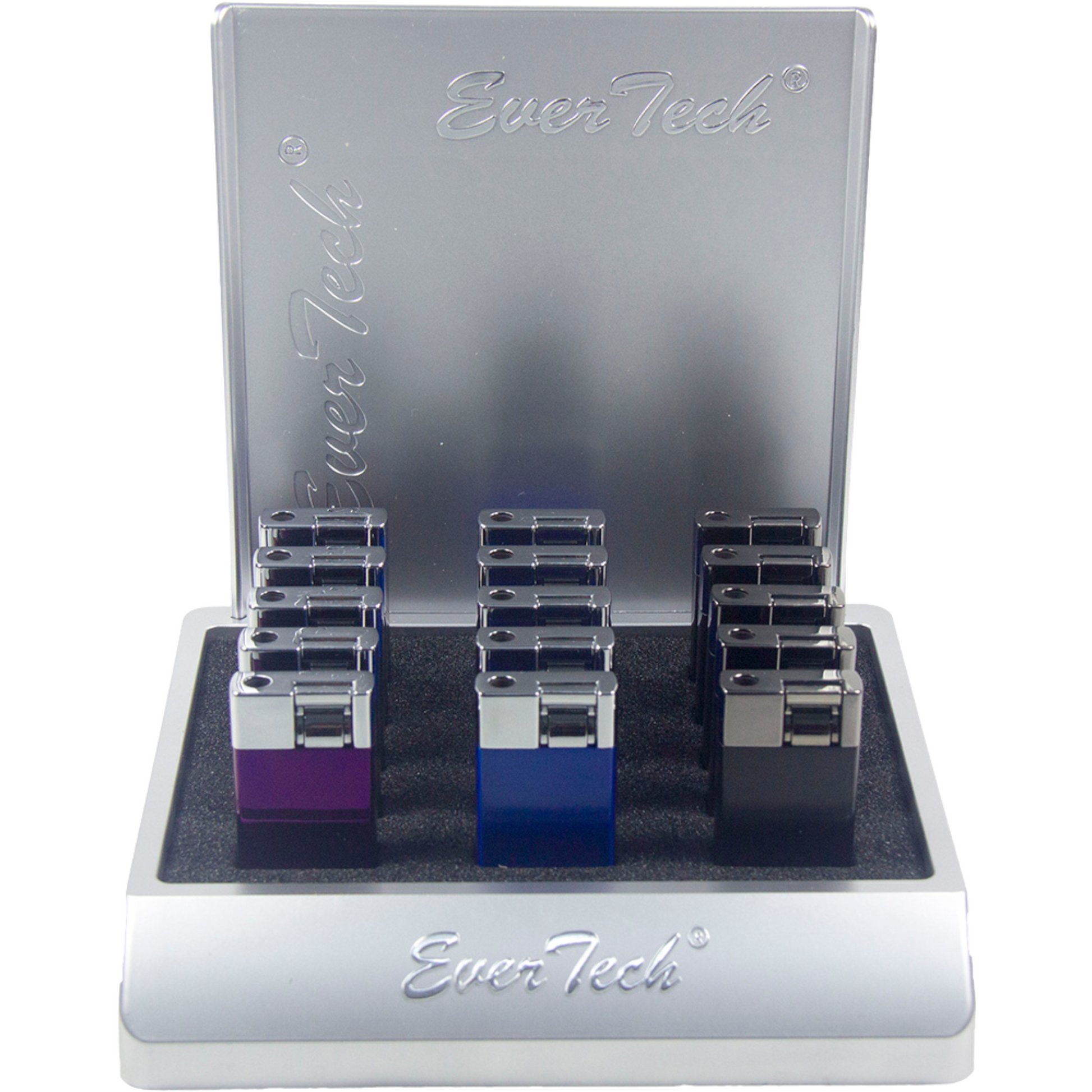 Ever Tech Retro Jet Torch Cigar Lighter with tab ignition button. Two-toned colors include silver top with black, blue or purple body.